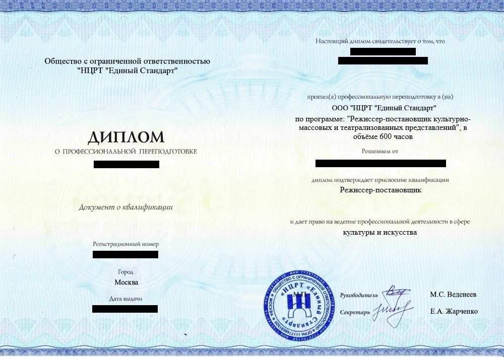 • «Режиссер-постановщик» с правом ведения профессиональной деятельности в сфере культуры и искусства