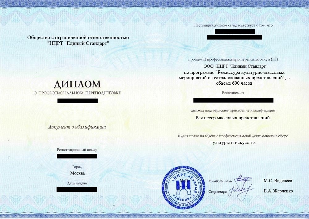 • «Режиссер культурно-массовых мероприятий и театрализованных представлений» с правом ведения профессиональной деятельности в сфере культуры и искусства