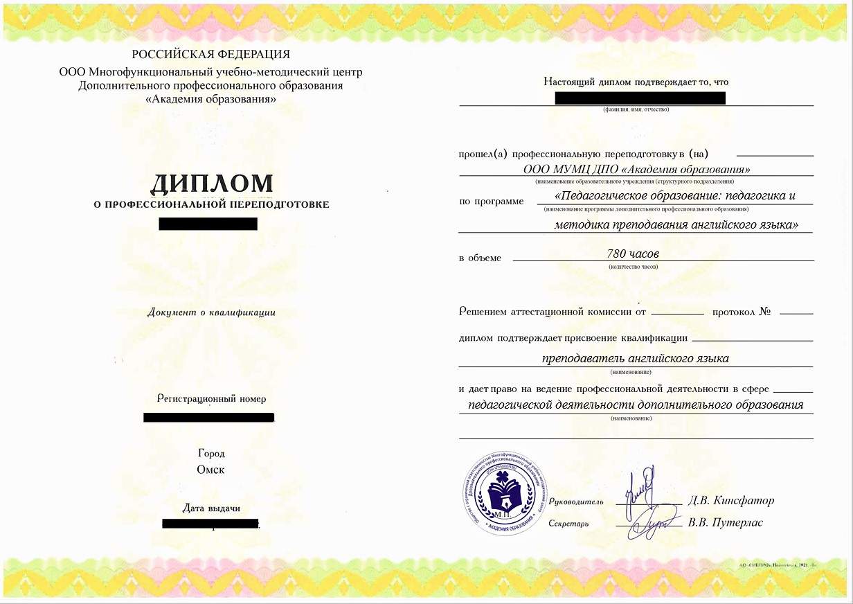 • Диплом о профессиональной переподготовке установленного государством образца. Срок действия: бессрочно