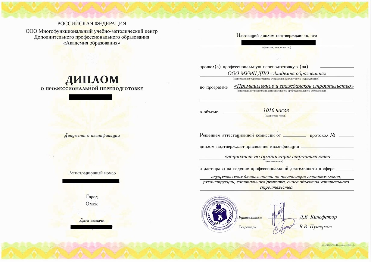 • «Специалист по организации строительства» с правом ведения профессиональной деятельности в сфере осуществление деятельности по организации строительства, реконструкции, капитального ремонта, сноса объектов капитального строительства